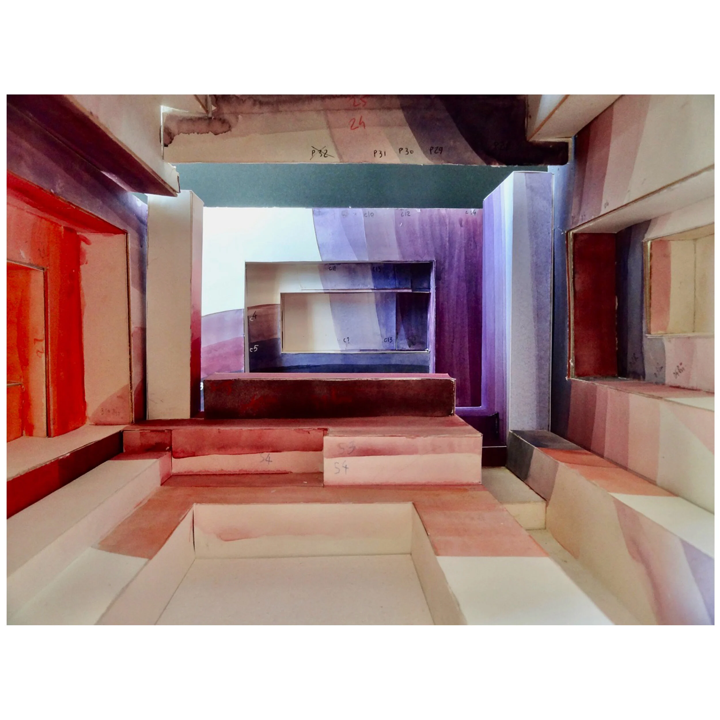 ↑ Watercolour. 21 x 29.7cm. (Musée National d'Art Moderne, Centre Pompidou, Paris.) Preparatory drawing showing the interior view of an auditorium in the cultural centre of a university. In tones of Persian violet and a carmine varnish, it clearly shows the impact of colour in a supergraphic that transforms interior forms. 1966