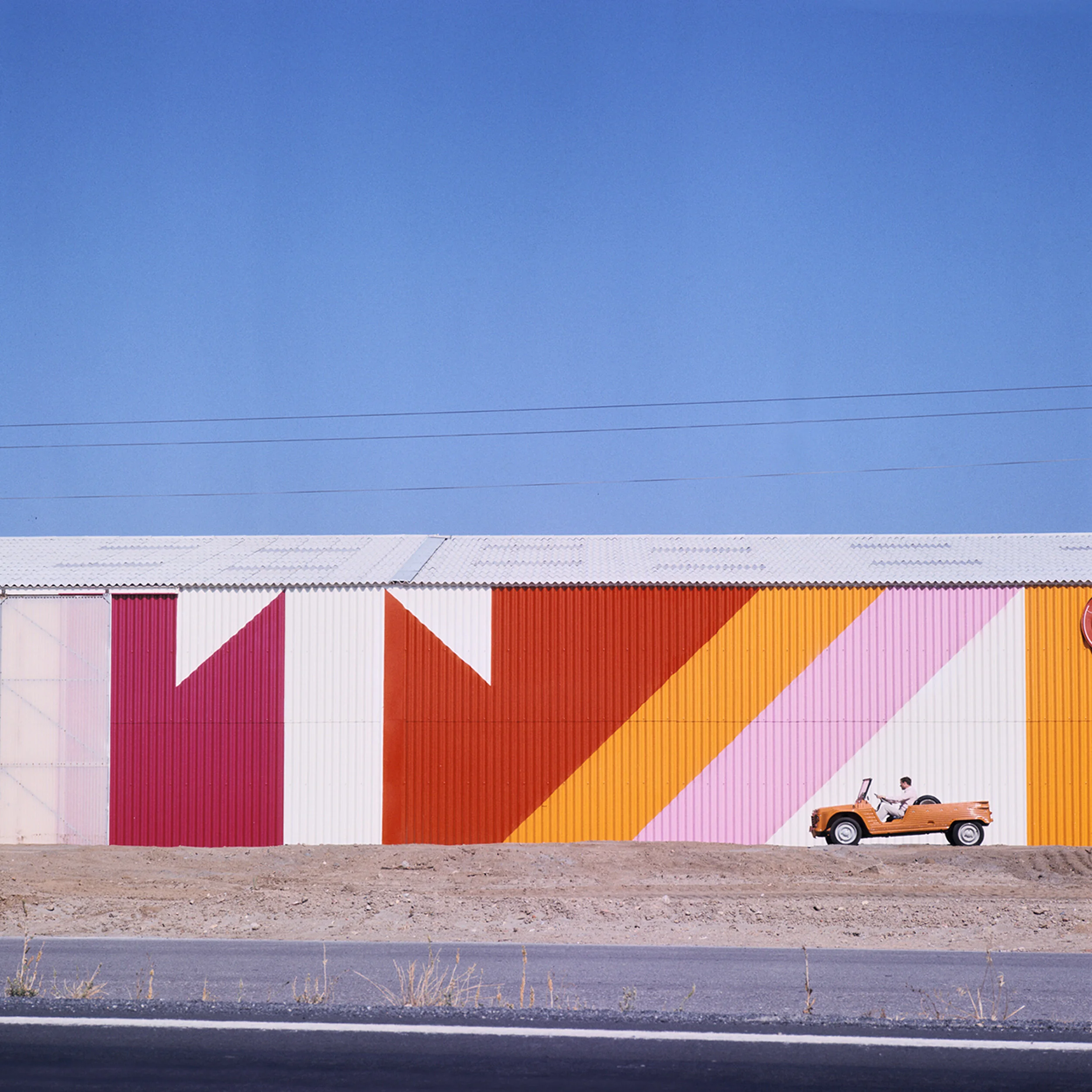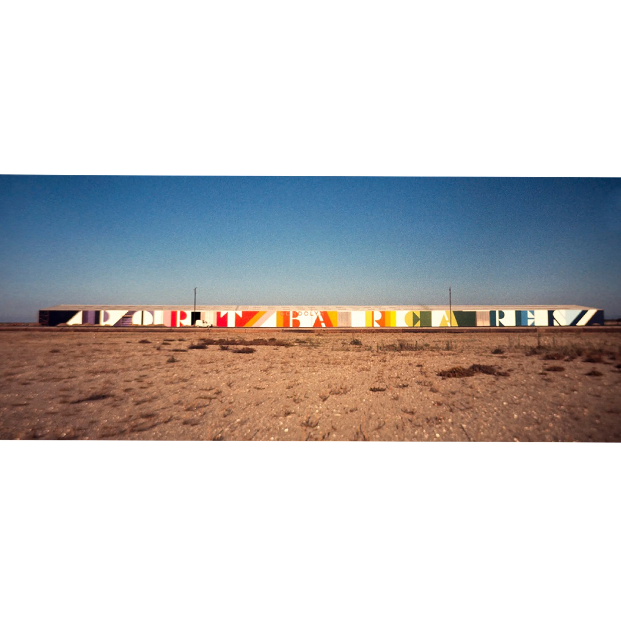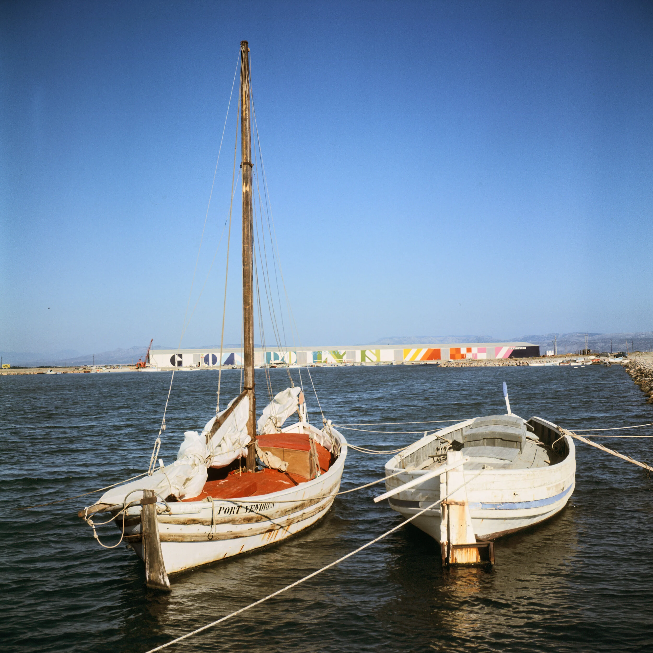 ↑ Gondolys. Supergraphics for a boat-building yard. The location of this industrial building on the edge of the coastal resort of Port Barcarès suggested a supergraphic decoration in shimmering colours. 1969