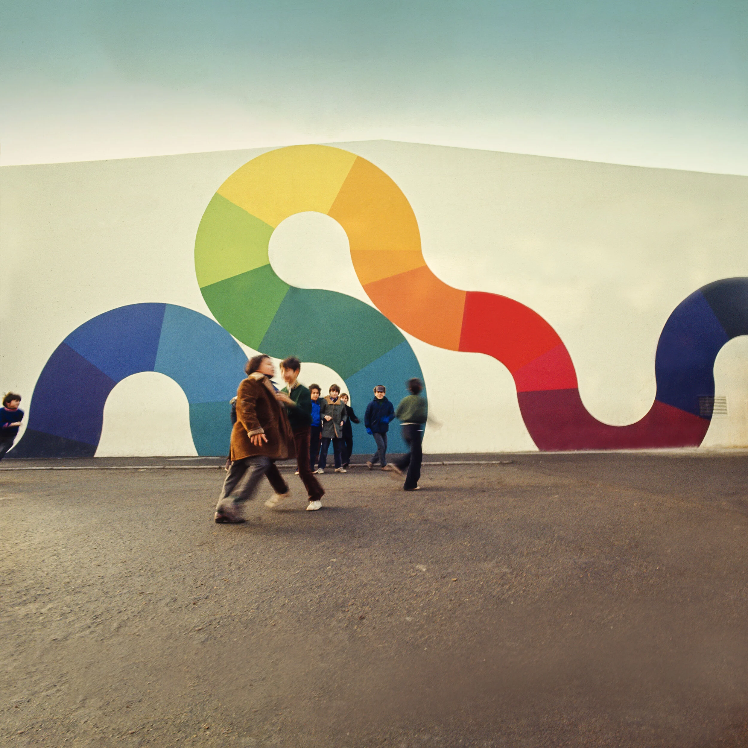↑ École Les Maradas, Cergy-Pontoise. Architect: Georges Pencréac’h. The fan-shaped architecture of this school suggested a series of cold shades for the southern side and warm shades on the northern side. The supergraphic emphasises the building’s cubic design. 1972